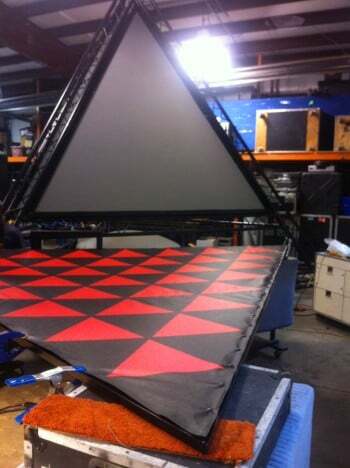 The pyramids open up and reveal 12×12 video screens while hiding all the video equipment that runs the screens in the base while another pyramid houses huge speakers. Ultimately, the pyramids were designed as both festival décor and as practical working devices to bring the show closer to the thousands who throng the festivals Woodstock-style.
