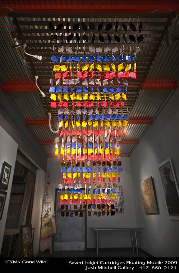 Hanging Cartridges is a ceiling-to-floor suspension mobile made from more than 360 plastic inkjet cartridges. Josh came up with the idea then worked with Drury University student architect Justin Petersburg to figure out how to create the piece. Although the idea itself was simple, the process of building the mobile was more complex. That’s because they wanted to design the mobile so that it could be transported and reassembled at another site, perhaps in different configuration.