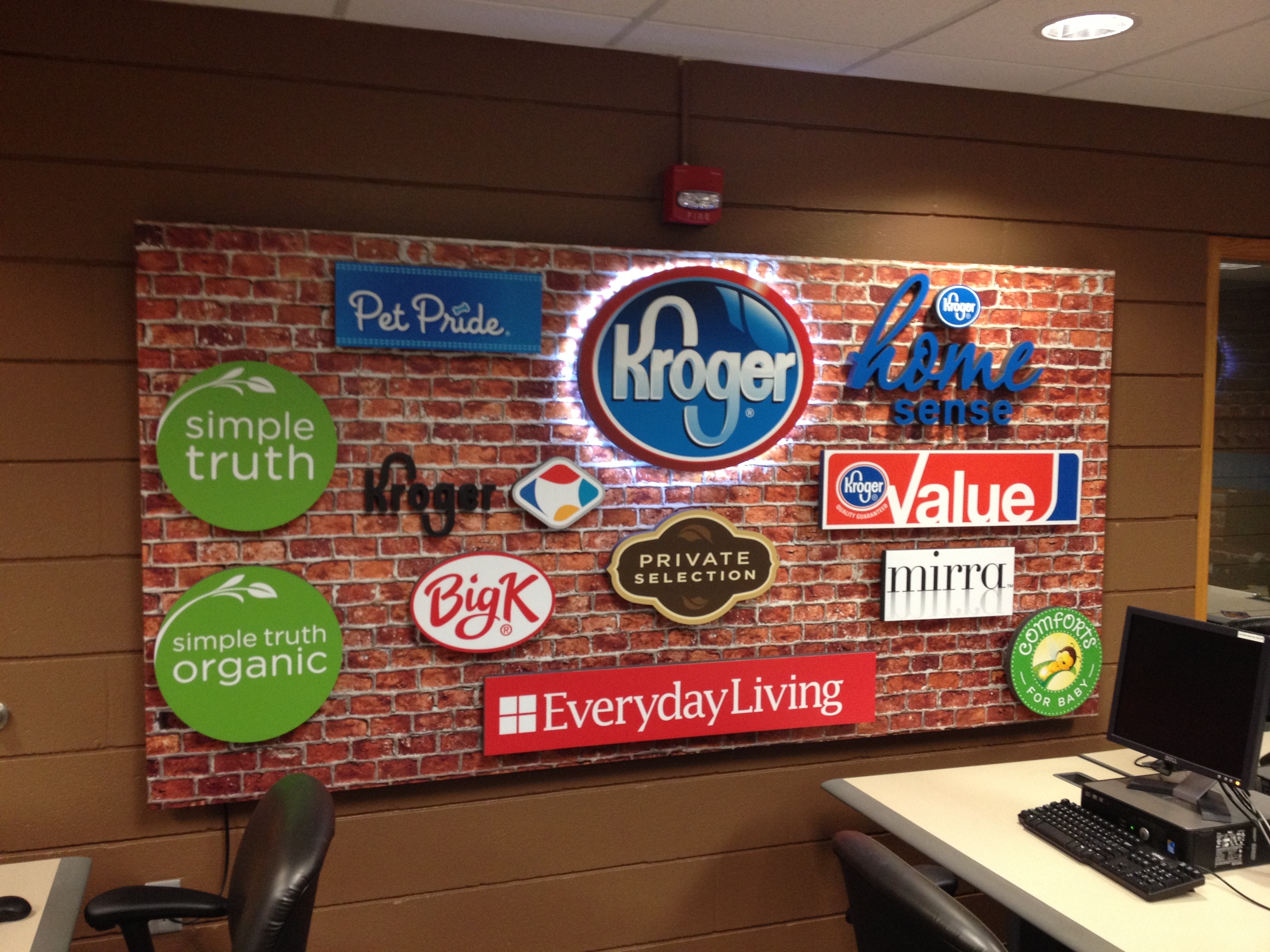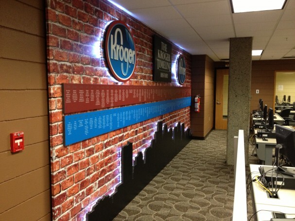 There are three different panels in the room: the main panel on the front wall is 240″ x 8′ and the other two panels on the sidewalls are 4′ x 8′. Rogers could have printed all the graphics, logos and photos and applied the prints to the walls or onto offset panels, but this treatment ensures the drama Kroger wanted to create.