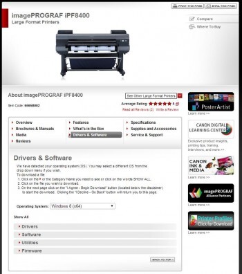 The tool, which you can click here to access, is quick and easy to use. This link is to the iPF8400 printer Drivers and Software site. To find your printer, select the printer from the See Other Large Format Printers drop-down menu located toward the top of the page, toward the right and below the image of the printer.