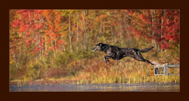 Schulze asked the client to throw a tennis ball straight off the dock to ensure the dog would be in the range Schulze set for sharp focus. Schulze measured the width of dock and found the f-stop that would encompass that range and set the shutter speed as fast as possible to catch not only the dog in mid-air, but the water droplets that flew off the dog as it jumped.