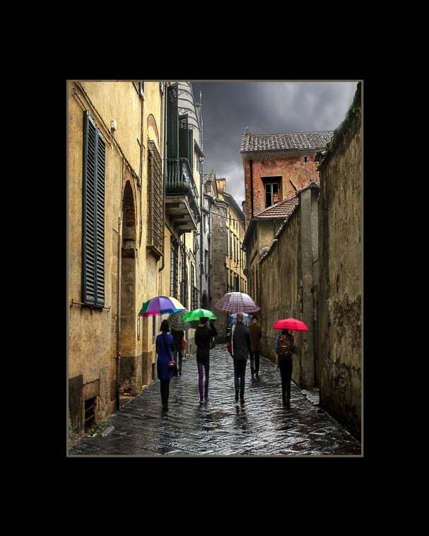 Cook might just have something here as this print won Best of Show for 2013 and a LexJet Sunset Print Award in the Florida Camera Club Council (FCCC) competition. Taken at dusk in the rain in Lucca, Italy, an old walled city in the Tuscany region, Cook rushed down to capture the people walking toward her on the street. She didn’t make in time and instead captured this shot of them walking away.