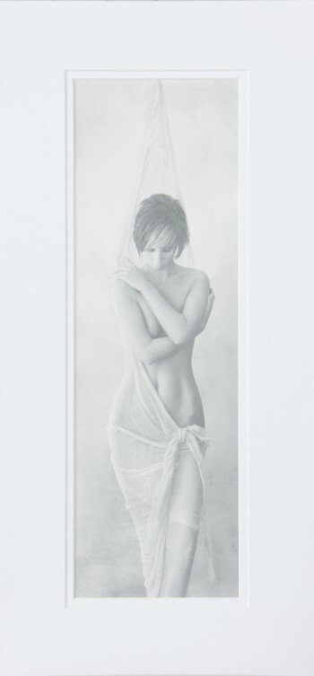 “I wrapped myself in material and was clicking the remote while I was trying to get wrapped in the material. I had a full length mirror next to the tripod so I could see the angle I was shooting. It was a three or four hour process,” says Kline. “I rendered it in black and white and brought the opacity down to about 40 percent so that it’s light and airy looking.”