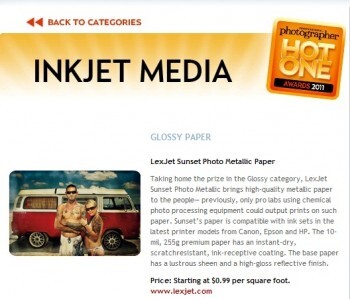 As reported earlier at the LexJet Blog, in the Inkjet Media category LexJet took three of the four Hot One Awards: Sunset Photo Metallic Paper in the Glossy category, LexJet 8 Mil ImagePro Satin in the Semi-Gloss/Luster Paper category, and Sunset Select Gloss Canvas in the Canvas category.
