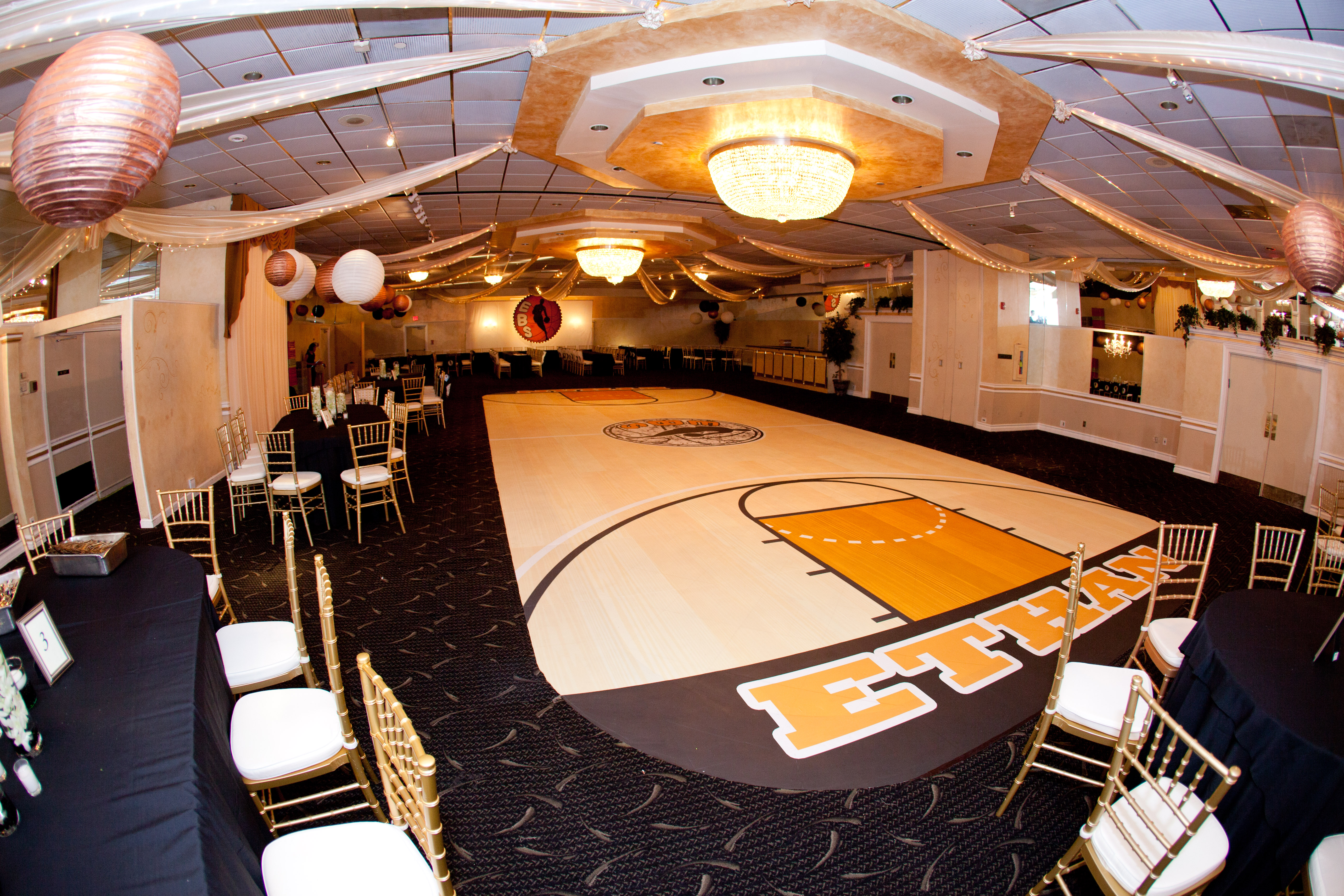 The party planner, Marquis Florals & Event Design by Kim in Matawan, N.J., was interested in doing something completely off the wall, both literally and figuratively, and asked Brett if he could create a basketball court on the dance floor at the venue. Having worked with Photo Tex PSA repositionable fabric from LexJet before, Brett thought this material would be the perfect one-night dance floor material.