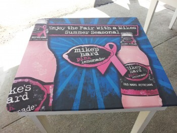 “It’s difficult to get our name out there because every inch of the fair is covered with ads. You have to be creative about it, so we thought we’d decorate these tabletops at the fair for the various brands we carry, like Boulevard, Mike’s Hard Lemonade, Coors Light and Smirnoff,” explains Owen. “We put some more eye-grabbing elements together in Photoshop, printed the images on LexJet Extreme AquaVinyl w/ PSA, applied them, and they turned out pretty awesome.”